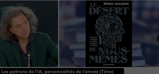 Invité sur Franceinfo TV pour revenir sur la "une" de Time Magazine, ayant fait des "architectes de l'IA" – ou, plus exactement, des destructeurs du monde auquel nous tenons – les "Personnes de l'année".