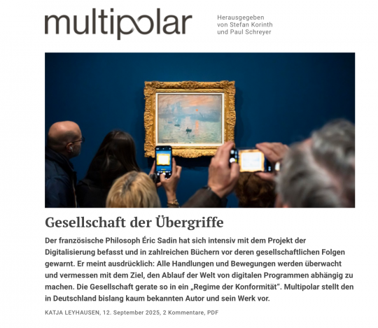 "Gesellschaft der Übergriffe", article signé Katja Leyhausen, à propos de plusieurs de mes ouvrages, paru dans le média allemand Multoplar.