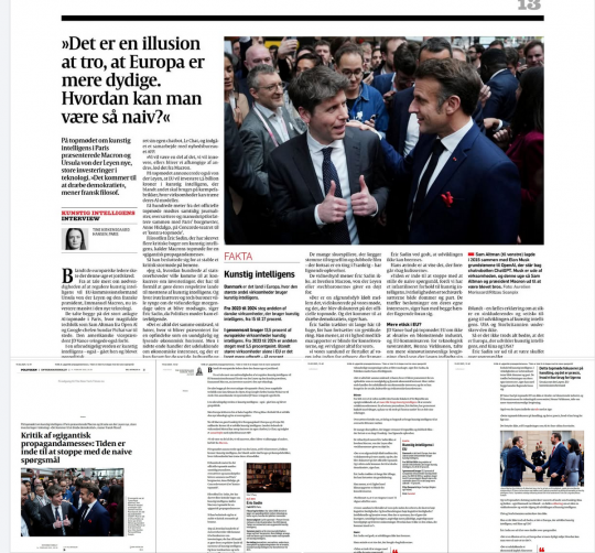 Entretien réalisé par la correspondante du journal à Paris, Tine Kirkensgaard Hansen. "Kritik af gigantisk propagandamesse : Tiden er inde til at stoppe med de naive spørgsmål". "På topmødet om kunstig intelligens i Paris præsenterede Macron og Ursula von der Leyen nye, store investeringer i teknologi. Det kommer til at dræbe demokratiet, mener fransk filosof."
