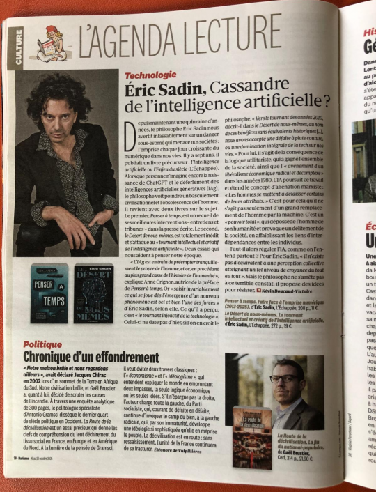 Kevin Boucaud-Victoire "Éric Sadin, Cassandre de l'intelligence artificielle ?", Marianne, 16-22 oct. 2025.
