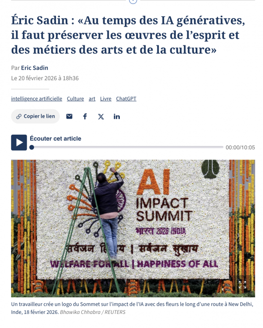 Tribune parue dans Le Figaro le le 20 février 2026, qui reprend les termes de l'"Appel de Paris" lancé à l'Unesco le 2 décembre 2025 : «Au temps des IA génératives, il faut préserver les œuvres de l’esprit et des métiers des arts et de la culture».