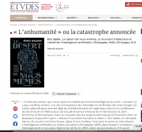 «"L’anhumanité" ou la catastrophe annoncée», Patrick Chastenet, Études, janv. 2026.