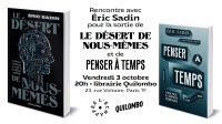 Rencontre autour du Désert de nous-mêmes et de Penser à temps à Librairie Quilombo, 23 rue Voltaire, 75011 Paris, le vendredi 3 octobre à partir de 20h, jour de la parution des ouvrages.